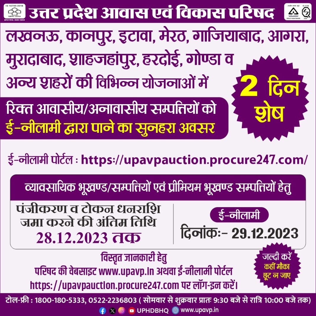 उत्तर-प्रदेश आवास एवं विकास परिषद ने टवीट किया – परिषद की विभिन्न योजनाओं में उपलब्ध व्यावसायिक भूखण्ड/ एवं प्रीमियम भूखण्ड संपत्तियों को ई-नीलामी द्वारा पाने का सुनहरा अवसर!